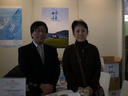 Zu erst habe ich den Stand eines Freundes (Marumoto Sakebrauerei) besucht. Er hat leider nicht verreisen können, weil er sich mitten in der Sake-Produktion in Japan befindet, aber seine Vertreter zeigten uns seine Produkte u.a. den ersten in Europa als Bio anerkannten Sake.