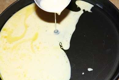 Sulla padella (piatto per il forno) ho messo 2 cuccihai d´olio d´oliva e ho fatto scivolare 1 bicchiere di pasta fluida.