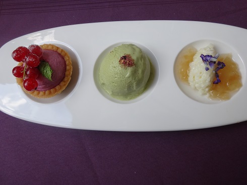 ハイデルベーレンのタルト、自家製抹茶アイスと花のソルト、ココナツミルクのライスとショウガのジェル(私の料理)
