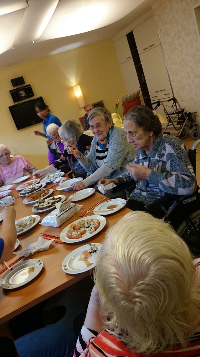 Beim Essen haben sie versucht, Stäbchen zu benutzen, und einige Leute haben es geschafft. Eigentlich darf man Sushi mit Fingern essen (^_^)