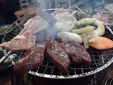 In Deutschland vermissen Japaner viele Gerichte. Das sind zum Beispiel Takoyaki (Kugel aus Weizenmehl, Ei und Oktopus), Okonomiyaki (japanische Pizza), Ramen (Nudelsuppe)… und vor allem Yakiniku (Tischgrill). Es gibt einige Yakiniku-Restaurants in Deutschland, aber wegen des Qualms darf man keine Holzkohle verwenden oder nur bei einer niedrigen Temperatur braten. Als wir bei den Eltern von Genki Haraguchi waren, haben sie uns in ein Restaurant eingeladen. Richtiger Yakiniku sieht so aus, aber es entsteht sehr viel Rauch. In Deutschland nicht möglich.