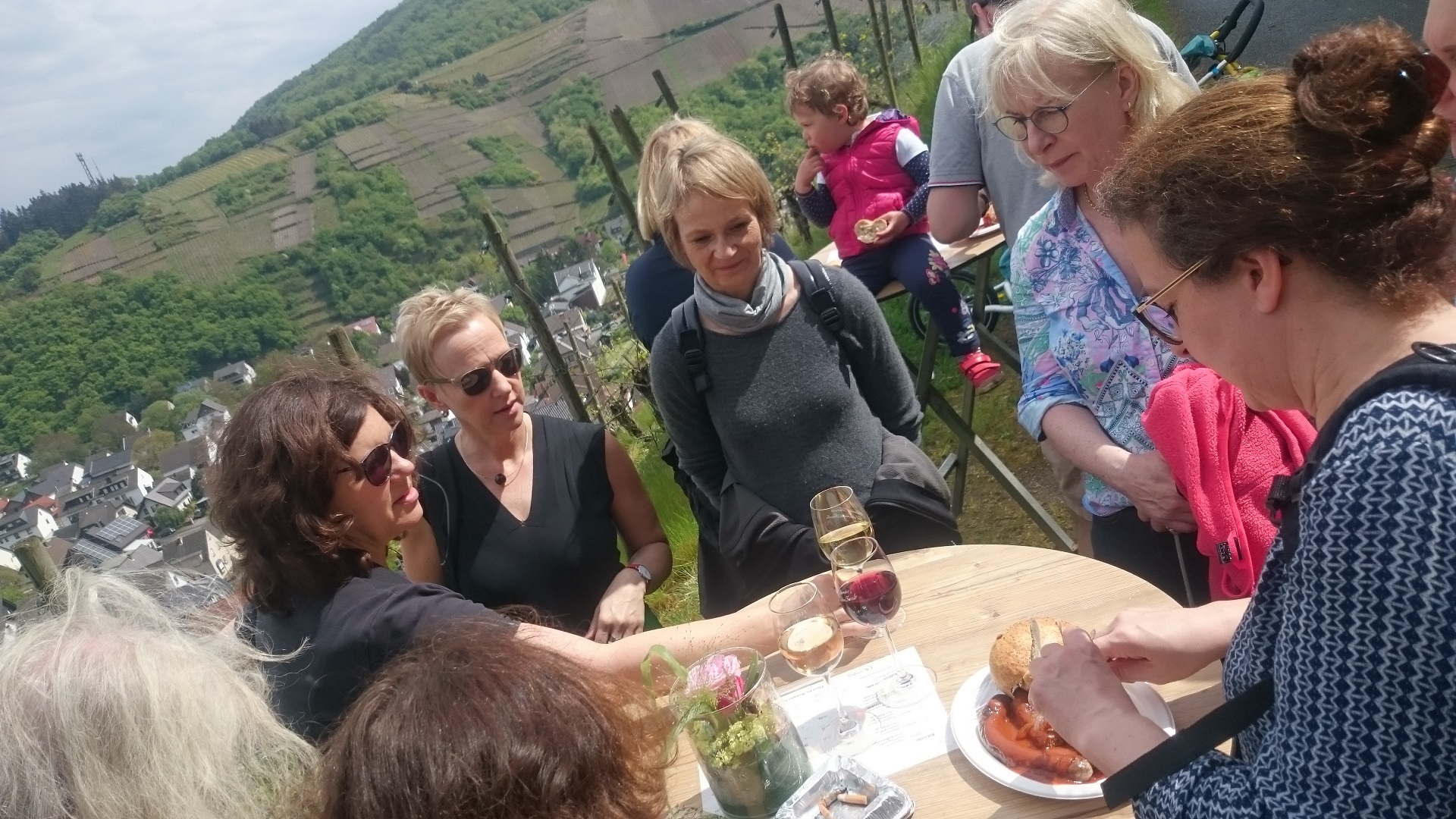 Mit Weingut Ernst Sebastian haben wir die Weinverkostung angefangen. Die Sonne ist gerade herausgekommen, und das nette Gespräch mit Herrn Sebastian machte uns glücklich. Um nicht besoffen zu werden, haben wir 4 Gläser Wein bestellt und mit 9 Damen verkostet.